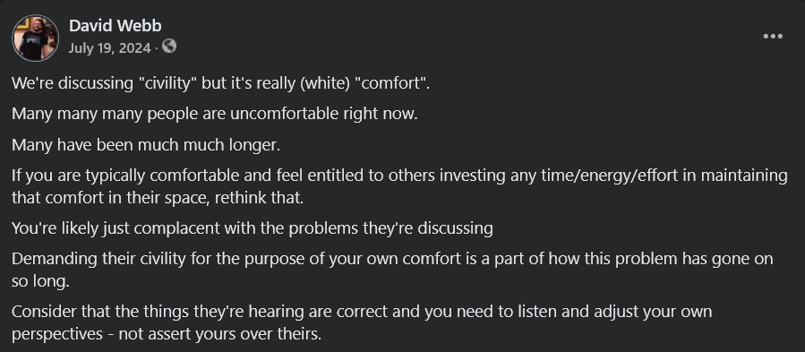 They’re not actually talking about civility, because civility would be about what is civil, like civil rights - civility would be considering equity and accountability. What they’re actually talking about is their perceived entitlement to being treated with dignity, even if they don’t treat others with dignity.