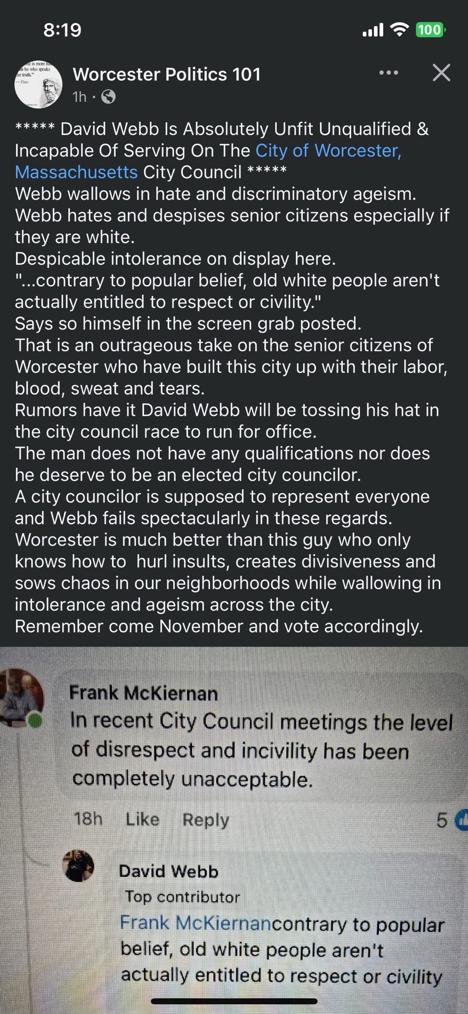 This exchange was on the Central mass Chabad’s post attempting to allege antisemitism against councilor Bergman, but it still is being determined if there was anything antisemitic said, or just people calling him a Zionist and Fascist. Either way, I guess antisemitism isn’t a concern for Steve Quist either, as he would rather draw attention to my “ageism” and use it to highlight why he feels I don’t have any qualifications and don’t “deserve to be an elected city councilor”