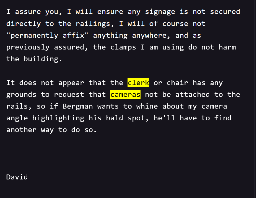 Now, I’m familiar with this one. Mayor Petty asked at the end of the June 25th city council meeting "I just ask that next week we not allow anything on the banisters... nothing be attached to anything in the council room" and that was pretty much directed at me. This was the nicer part of my response at the time.