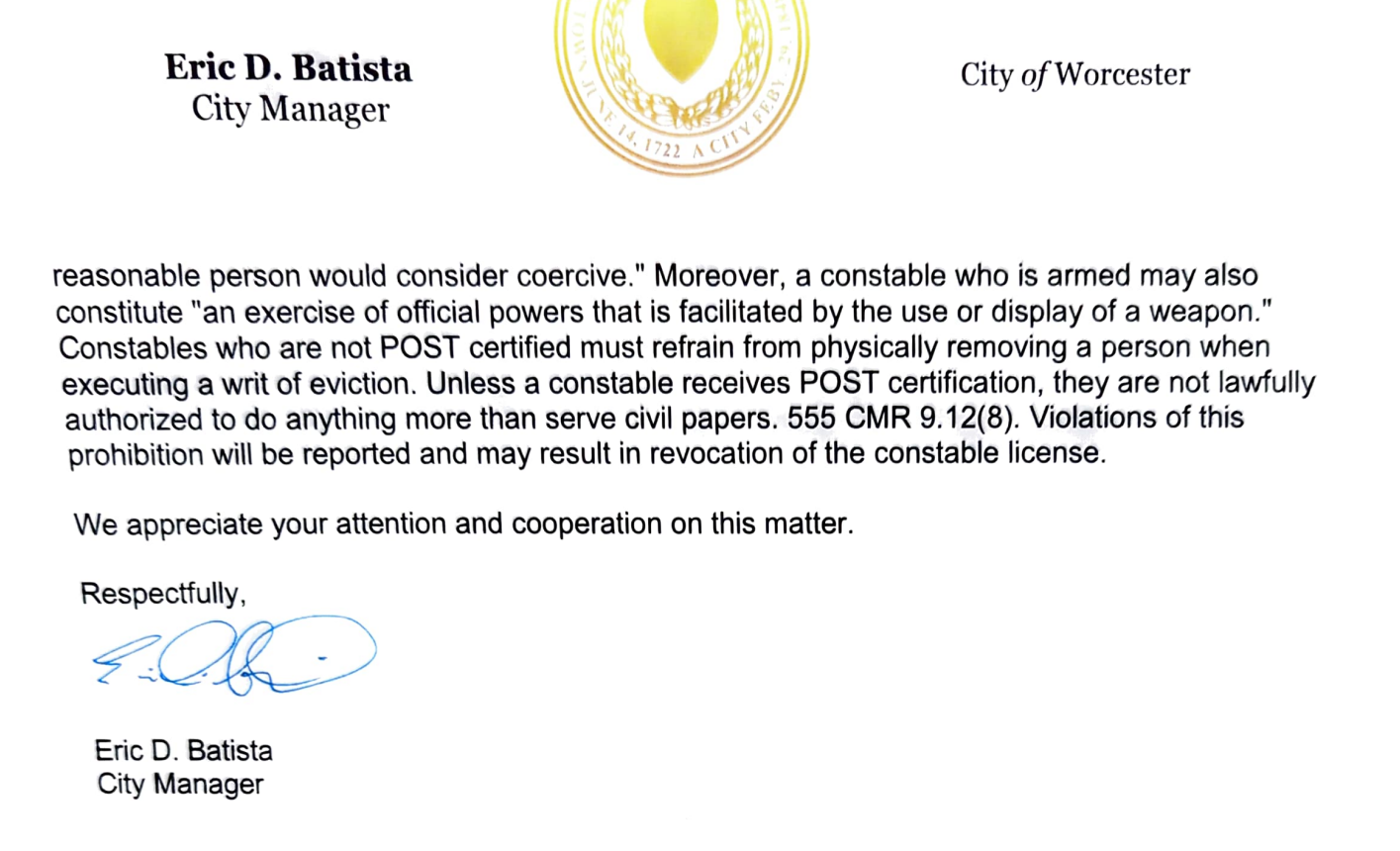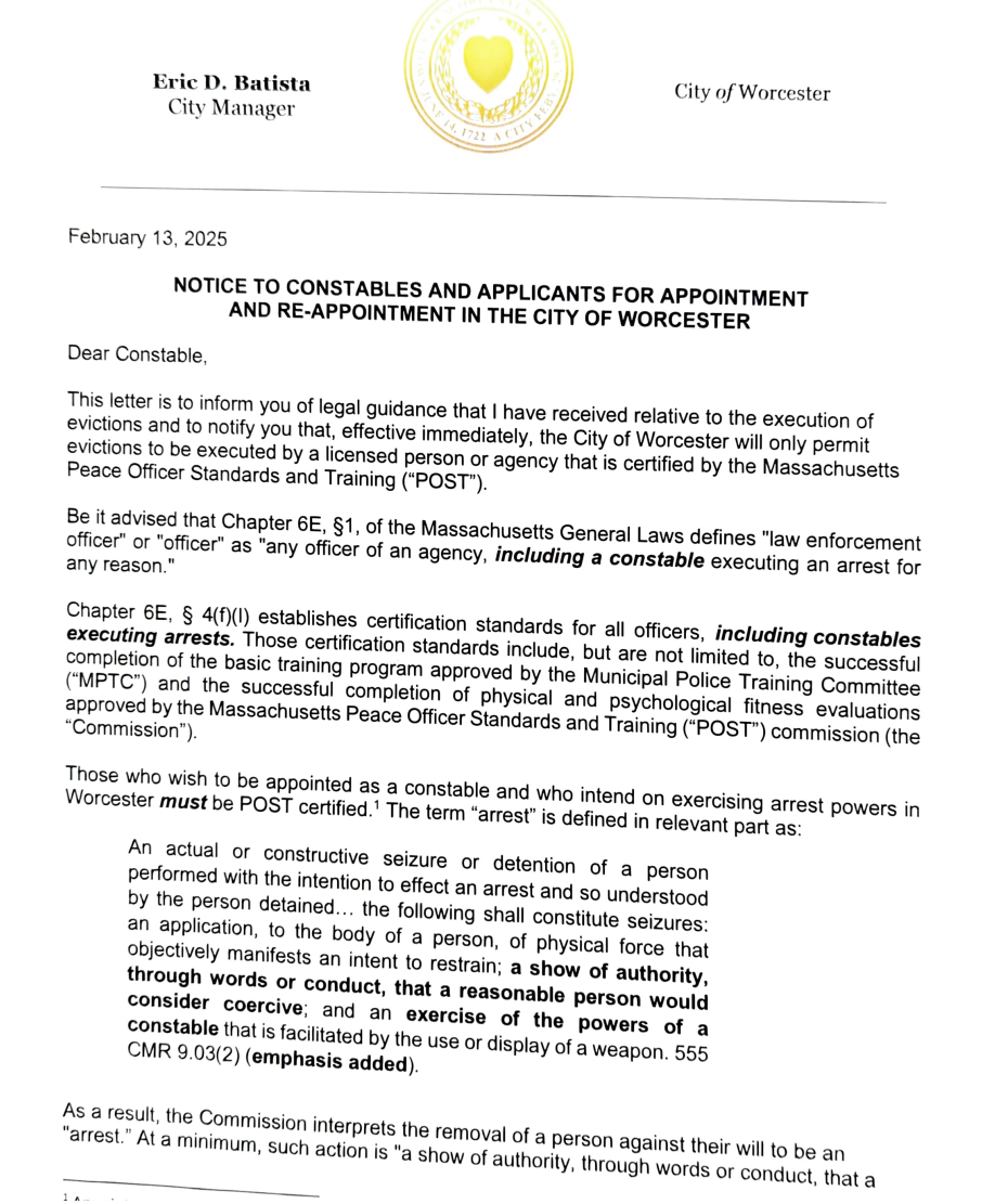 The commission spent the past three years ensuring all twenty two thousandish officers in Massachusetts were certified - some chose to retire instead. Constables avoided it, which Worcester has finally taken a stand on, by sending this notice
