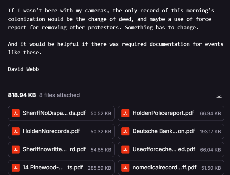 If I wasn't here with my cameras, the only record of this morning's colonization would be the change of deed, and maybe a use of force report for removing other protestors. Something has to change. And it would be helpful if there was required documentation for events like these.