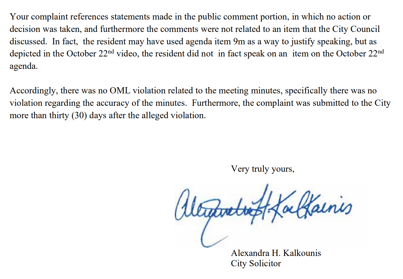 After acknowleding my complaint in part and citing the open meeting law, our new city attorney says