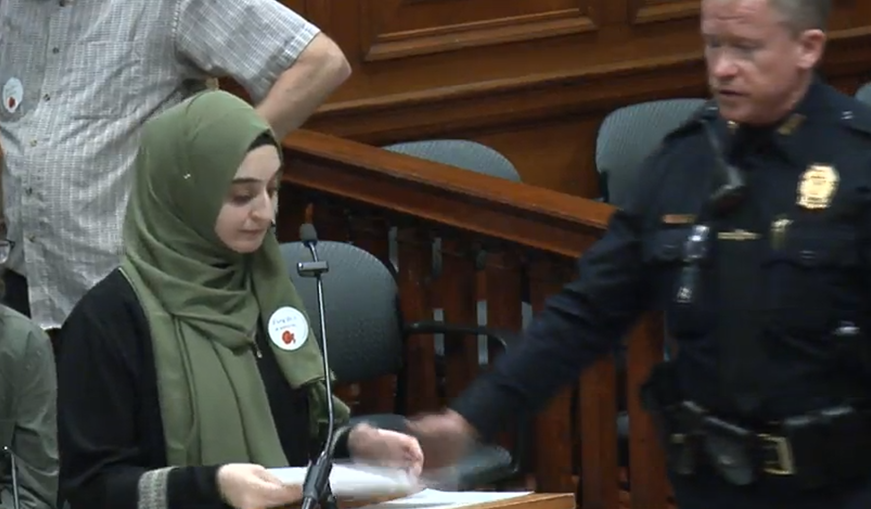 As I understand it, she was expressing her viewpoint, in clear contrast to the viewpoint that was allowed by the Worcester city solicitor in a petition initially penned by Mayor Petty, but brought forward by councilor Bergman, that the Worcester city council adopted on October 17, 2023 for the City of Worcester to "condemn the recent barbaric and inhuman taking of hostages in Israel" without addressing the ongoing genocide and colonization of Palestine by Israel. Furthermore, the speaker did not in fact state whether they were speaking in support, or opposed to item 9M, as the chair muted their microphone and Worcester Police Captain Matthew Early escorted them away from the podium before they were allowed their two minutes and were able express a position on the item they were speaking on.