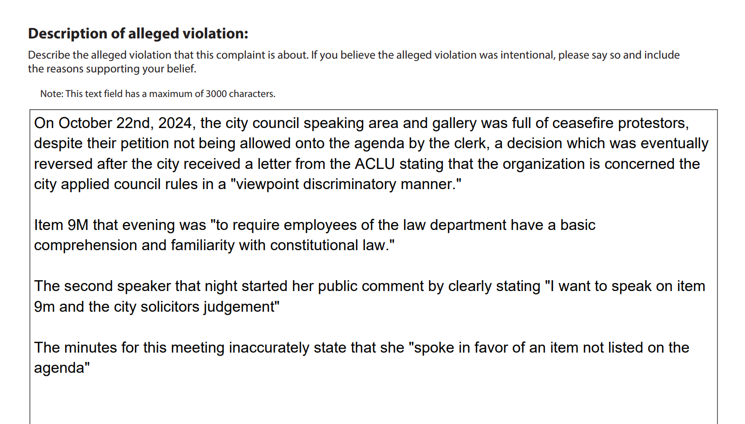 I am appealing this complaint, seeking that the City of Worcester correct the meeting minutes to accurately document that the speaker attempted to speak on item 9M but was still ruled out of order by the meeting chair as initially requested in my open media complaint filed with the city January 5th 2025 I have attached my attempt to resolve this directly with the city. Thank you for your consideration in this matter,